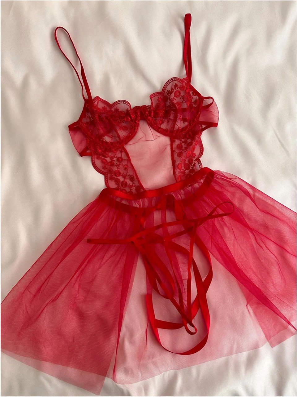 – Zarif çiçek desenleriyle süslenmiş, kırmızının romantik tonlarıyla dikkat çeken askılı babydoll.